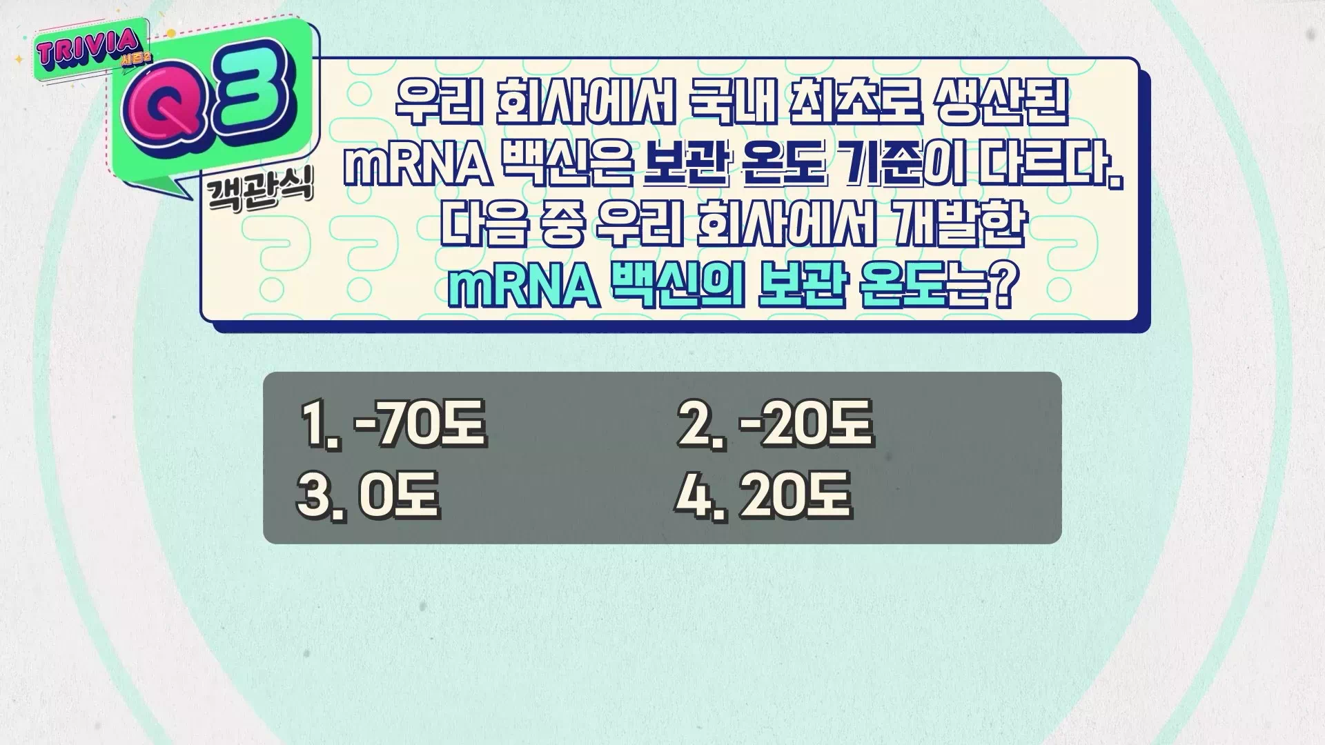 2번과 4번 중에서 고민하던 프로님. 보관하기 어려운 온도에서 힌트를 얻고, -20도라는 정답을 맞춥니다. 백신이 생산된 후 환자에게 전달되기까지 안정적인 온도를 유지해주는 것이 백신 생산 기술의 핵심 중 하나랍니다 :)